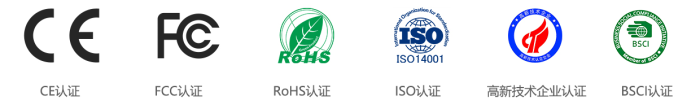 公司高度重视自主创新和技术沉淀,已累计获得百余项核心知识产权,包括发明专利、实用新型专利和软件著作权。我们实行严格的质量管理,已通过IS0 9001,ISO 14001,IS0 45001,BSCI,IATF 16949等权威体系认证。所有产品均符合国际标准,并通过REACH,UKCA,FCC,CE,ROHS等国际认证。